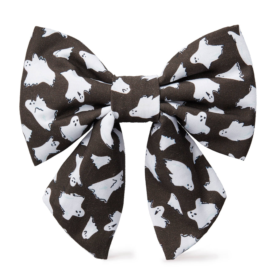 Get in the Howl-o-ween "spirit" in this handdrawn print by artist Jane Black. Can you spot the spooktacularly cute ghost pup? Details * Removable bow tie gives an extra dose of dapper when you need it * Slides onto most standard-width collars with elastic loops on the back * Two loops for added stability (no more bow tie droop!) * Choose between two sizes: * Small (4" W x 2.5" H): for smaller dogs or dogs looking for that classically preppy bow tie look * Large (5" W x 3.5" H): for bigger dogs, dogs with long fur, or small dogs looking to make a statement Care Instructions Hand wash or machine wash in cold water. Air dry flat.