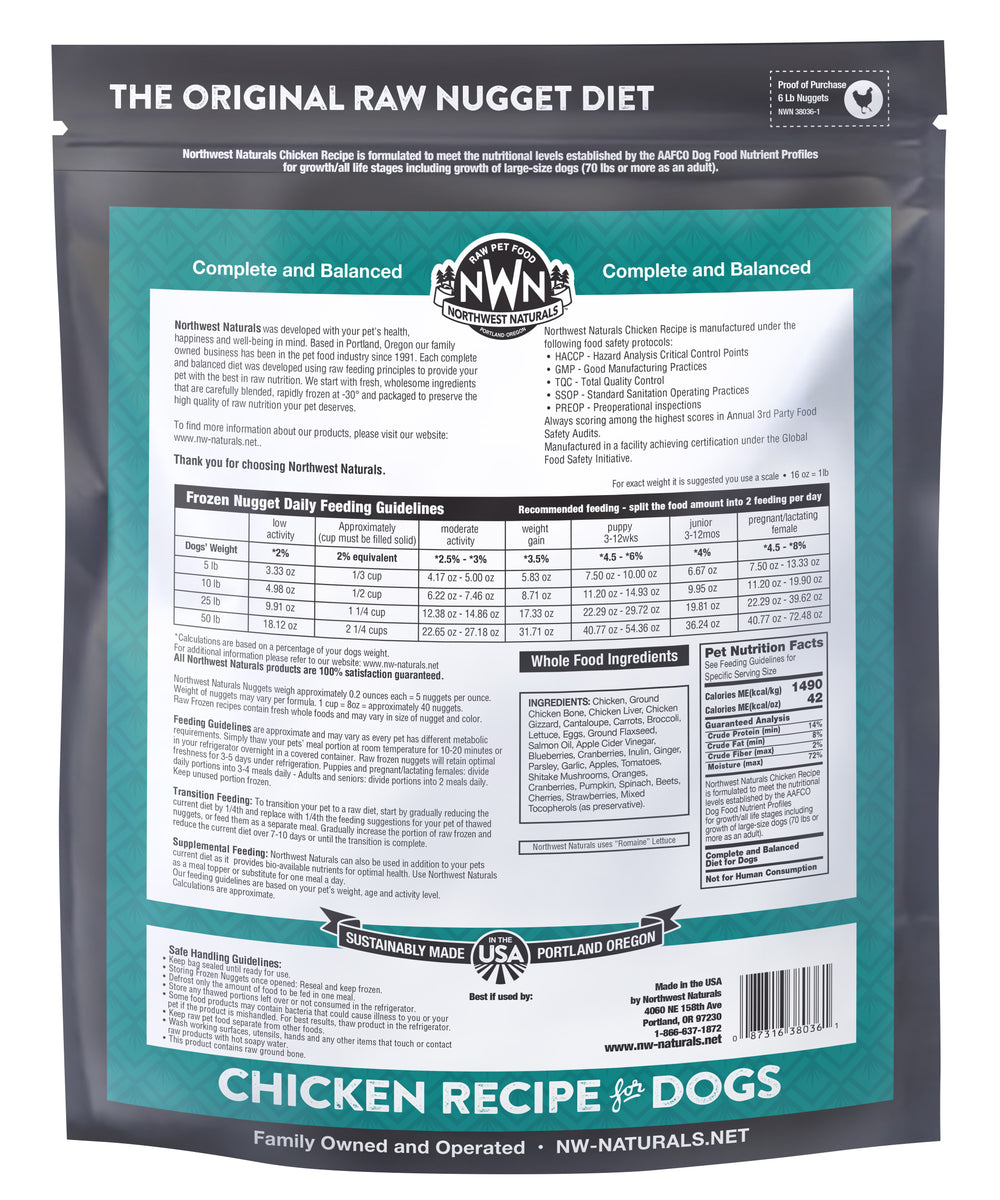 A 6 pound resealable, easy-carry bag holds IQF (Individually Quick Frozen) nuggets which weigh approximately .20 oz each, 80 to the pound. The formulas are ground, formed and then quick frozen at -30° for 10 minutes. Open the bag and pour the proper feeding amount into your dogs bowl. The small nuggets will thaw quickly and are small enough for the tiniest dogs or puppies. The pourable feature means that you never handle the raw product and you place the portion you do not use back into the freezer.