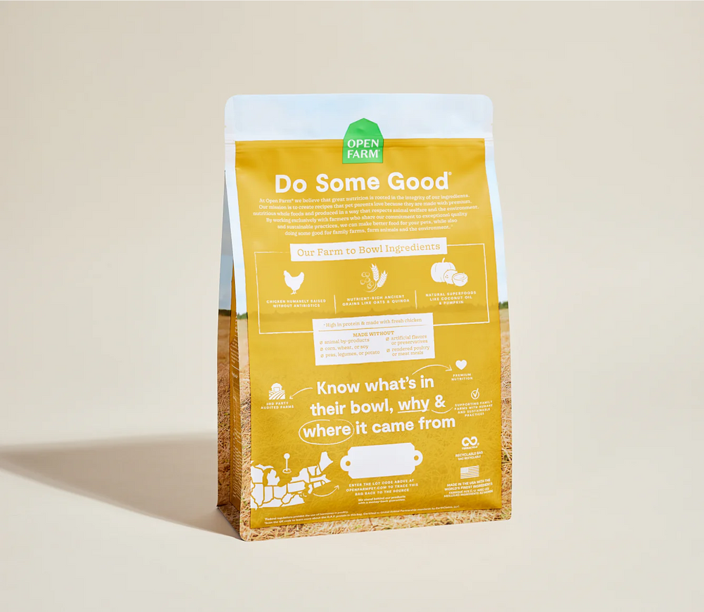 Open Farm Harvest Chicken & Ancient Grains recipe is formulated to meet the nutritional levels estimated by the AAFCO Dog Food Nutrient Profiles for all life stages except for the growth of large-size dogs (70 lbs or more as an adult)