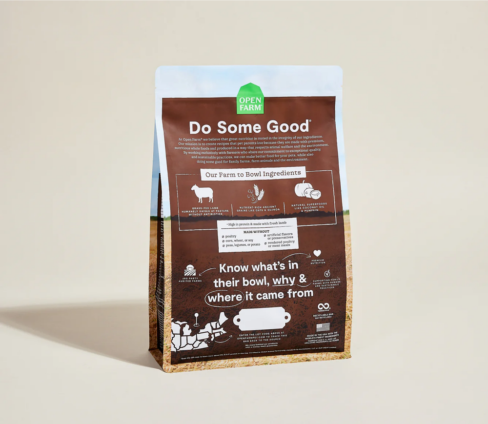 Open Farm Pasture-Raised Lamb & Ancient Grains recipe is formulated to meet the nutritional levels estimated by the AAFCO Dog Food Nutrient Profiles for all life stages except for the growth of large-size dogs (70 lbs or more as an adult)